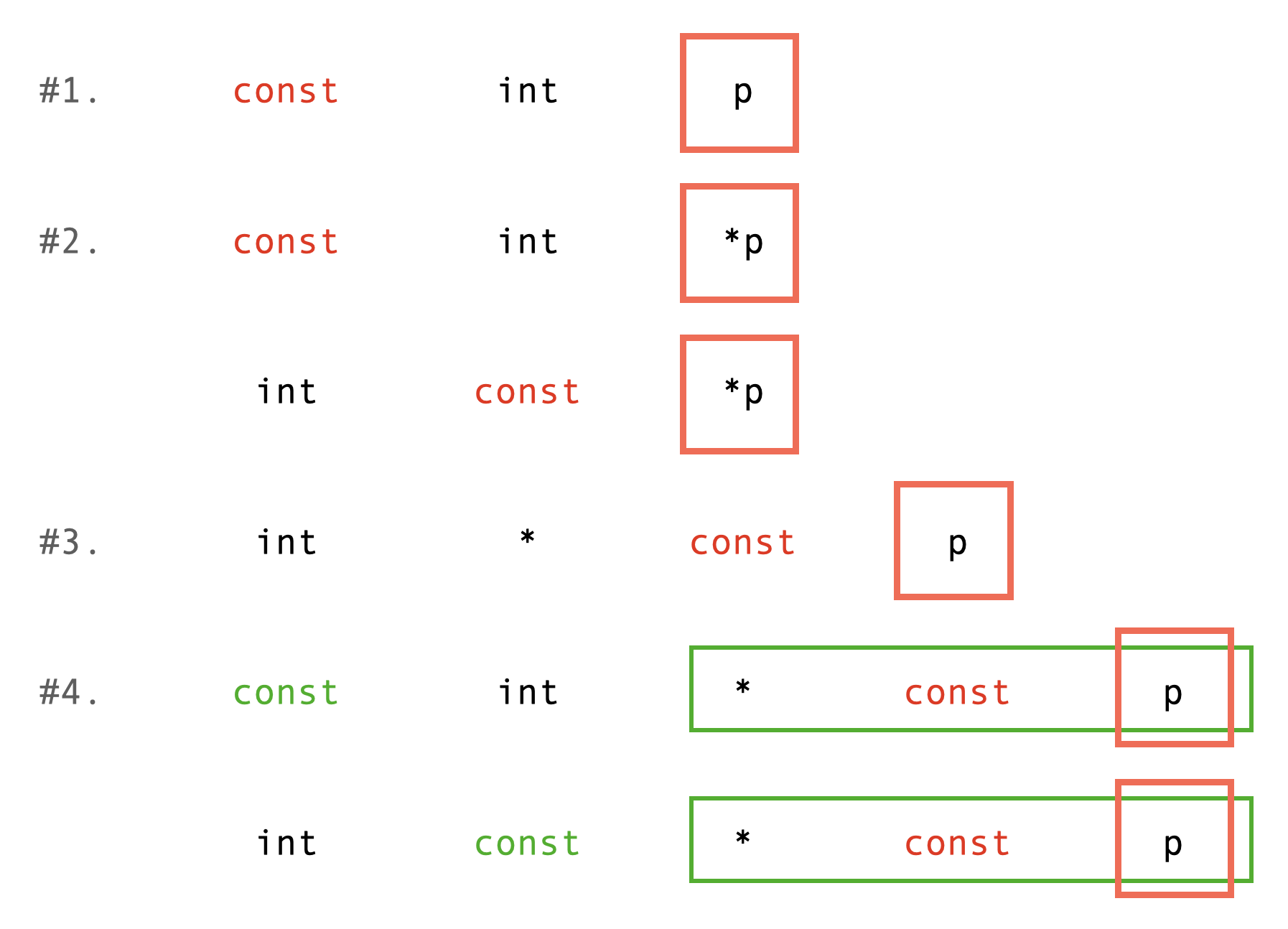 이와 같은 선언에서는 int * 타입과 int 타입 모두 상수화 된다. 따라서 p는 항상 동일한 메모리 위치를 가리키면서 p가 가리키는 메모리에 저장된 값 역시 변경할 수 없다.